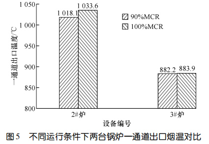 兩臺(tái)設(shè)備運(yùn)行 11 個(gè)月后進(jìn)行了能效測(cè)試。圖5對(duì)比了 90%鍋爐大的連續(xù)蒸發(fā)量(簡(jiǎn)稱 MCR)和MCR 條件下鍋爐一通道的出口煙溫。圖6示出了MCR運(yùn)行條件下兩臺(tái)鍋爐熱效率的對(duì)比。結(jié)果顯示:在 90%MCR 運(yùn)行條件下,3#爐一通道出口煙溫比2#爐低 135.9 ℃,在MCR 運(yùn)行條件下,3#爐一通道出口煙溫比 2#爐低 149.7 ℃,3#爐的熱效率比 2#爐高 0.64%。相較而言,使用膜式壁爐襯的3#爐在負(fù)荷相當(dāng)?shù)那闆r下,余熱鍋爐熱效率更高。