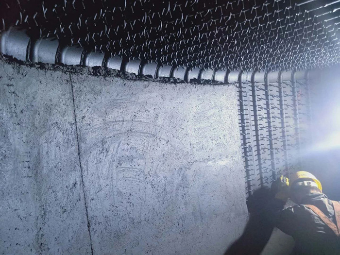 考慮到以上磨損的特點、耐磨材料的物理性能及施工特點,一般采用單層或多層耐磨耐火材料的敷設。單層敷設的部位包括水冷壁、屏式受熱面、水冷隔墻、雙面水冷壁、汽冷分離器等薄襯里處,用φ6或 φ10 的圓柱銷釘( 或 Y 型 V 型銷釘) 將耐磨耐火澆注料支撐在管壁煙氣側。薄襯里更能經得起鍋爐起停時的快速熱沖擊,同時, 為增強其剛性及沖擊能力,需在澆注料中增加不銹鋼纖維。厚襯里分為兩層或三層,煙氣側為耐磨耐高溫的耐磨耐火磚砌筑或耐磨可塑料澆注而成, 內襯的保溫材料目的是減少熱損失,降低殼體溫度。