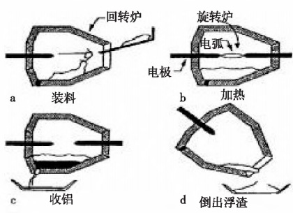 ALUREC法由丹麥阿加公司、霍戈文斯鋁業(yè)公司、曼公司三家公司聯(lián)合開發(fā),流程圖見圖4。主要流程為裝料、加熱、收鋁、倒出浮渣,該法主體設(shè)備為回轉(zhuǎn)式熔化爐,還可以用純氧作助燃劑,升溫速度快,可以有效減少燃燒過程產(chǎn)生的有機(jī)氣體,煙塵被煙罩吸收二次利用處理。此法優(yōu)點在于機(jī)械化程度較高和運行環(huán)境好;但金屬回收率要比炒灰低,一般在93%左右,且產(chǎn)生的殘余鋁灰還需進(jìn)一步處理。