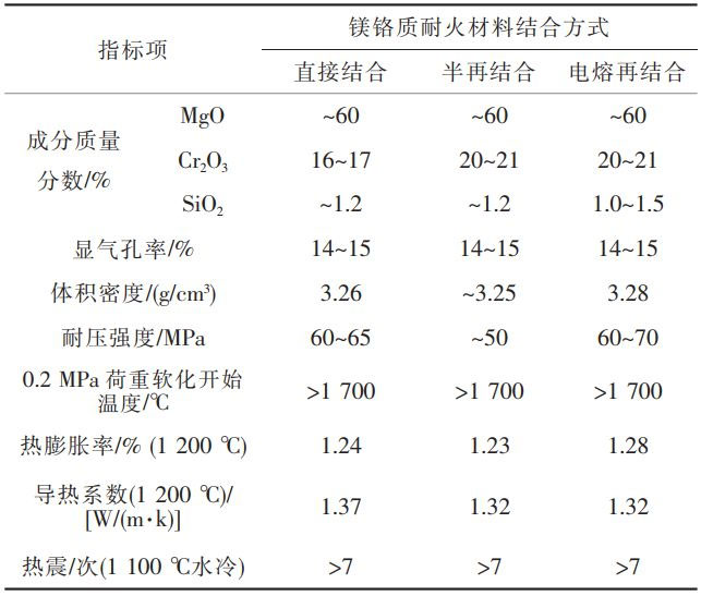 根據(jù)鎂鉻質(zhì)耐火材料的結(jié)合形式的不同,包括直接結(jié)合、半再結(jié)合、電熔再結(jié)合等鎂鉻質(zhì)耐火材料。其中,直接結(jié)合鎂鉻質(zhì)耐火材料是以高純燒結(jié)鎂砂和鉻鐵礦為原料,將電熔鎂砂與鉻礦直接燒結(jié);半再結(jié)合鎂鉻質(zhì)耐火材料是以電熔鎂鉻砂作屬粒,加入部分鉻礦和鎂砂或燒結(jié)合成鎂鉻料作細(xì)粉,高溫?zé)Y(jié)而成;電熔再結(jié)合鎂鉻質(zhì)耐火材料是將鉻礦與電熔鎂砂在電爐中電熔,制得電熔鎂鉻砂,再高溫?zé)Y(jié)而成。3類鎂鉻質(zhì)耐火磚材料特性對(duì)比,見(jiàn)表1。